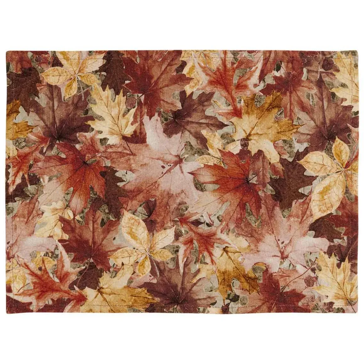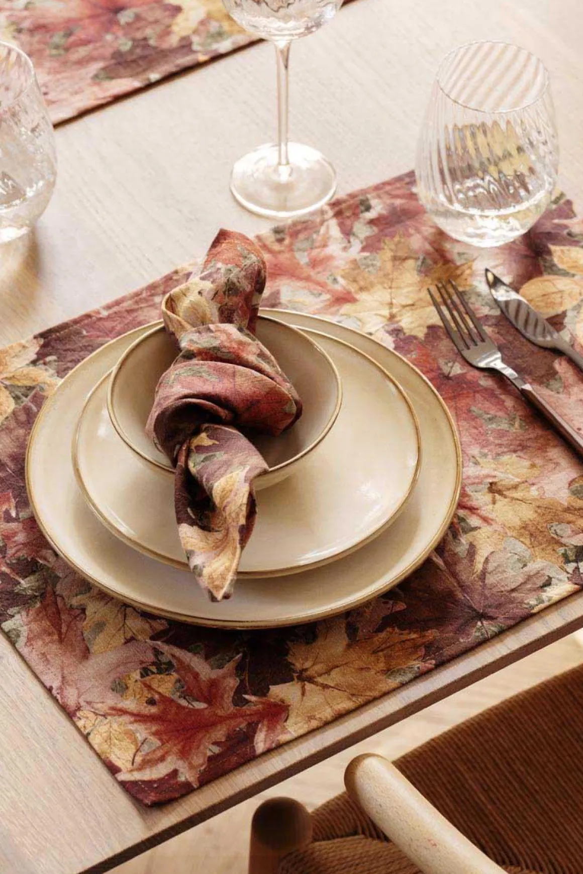 Bladene faller, men bordet blomstrer. Denne dekkebrikken bringer høstfølelsen helt inn til middagen med sitt frodige mønster av tørre blader i dype toner. Like fin til hverdag som til en lun søndagsmiddag med levende lys.
