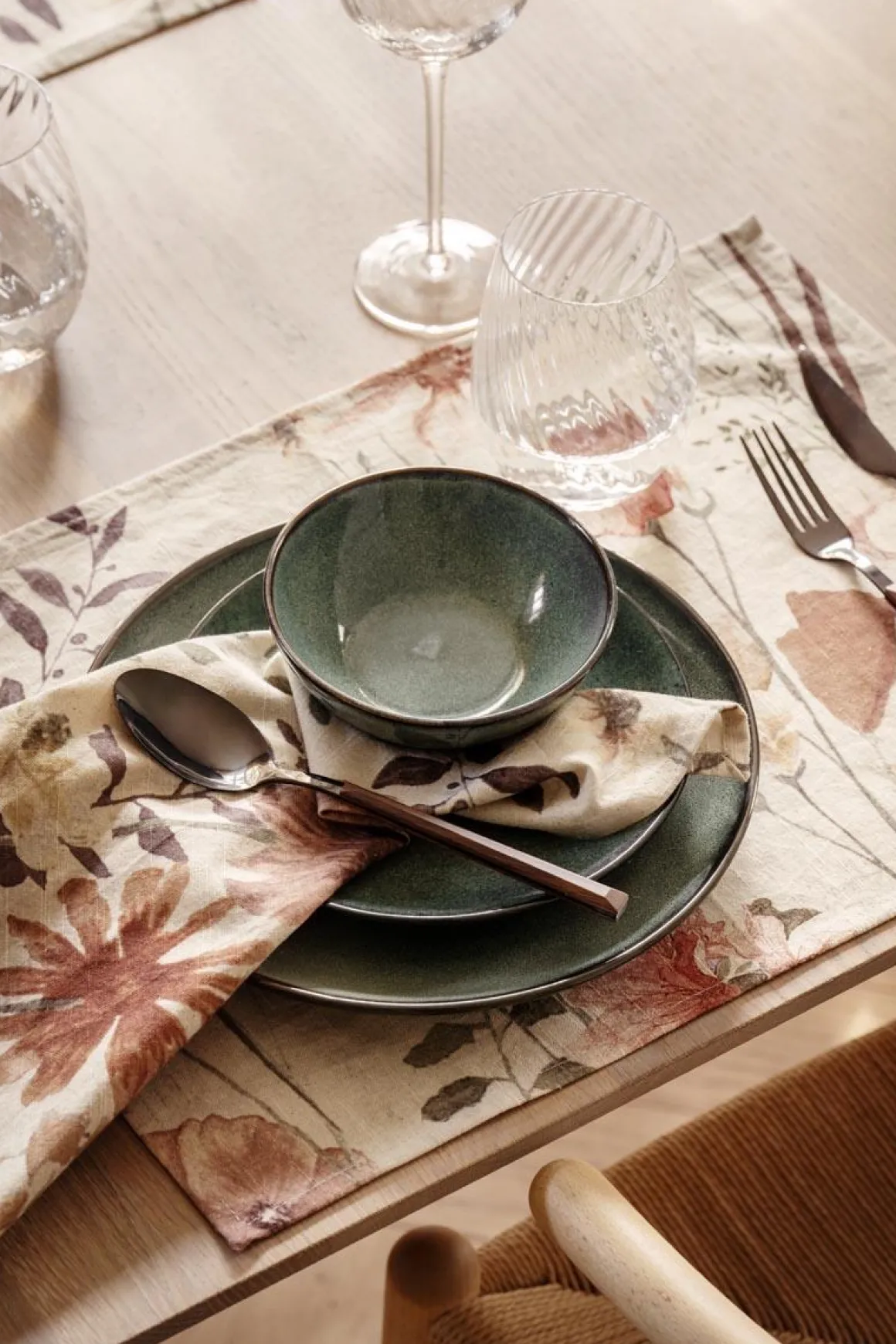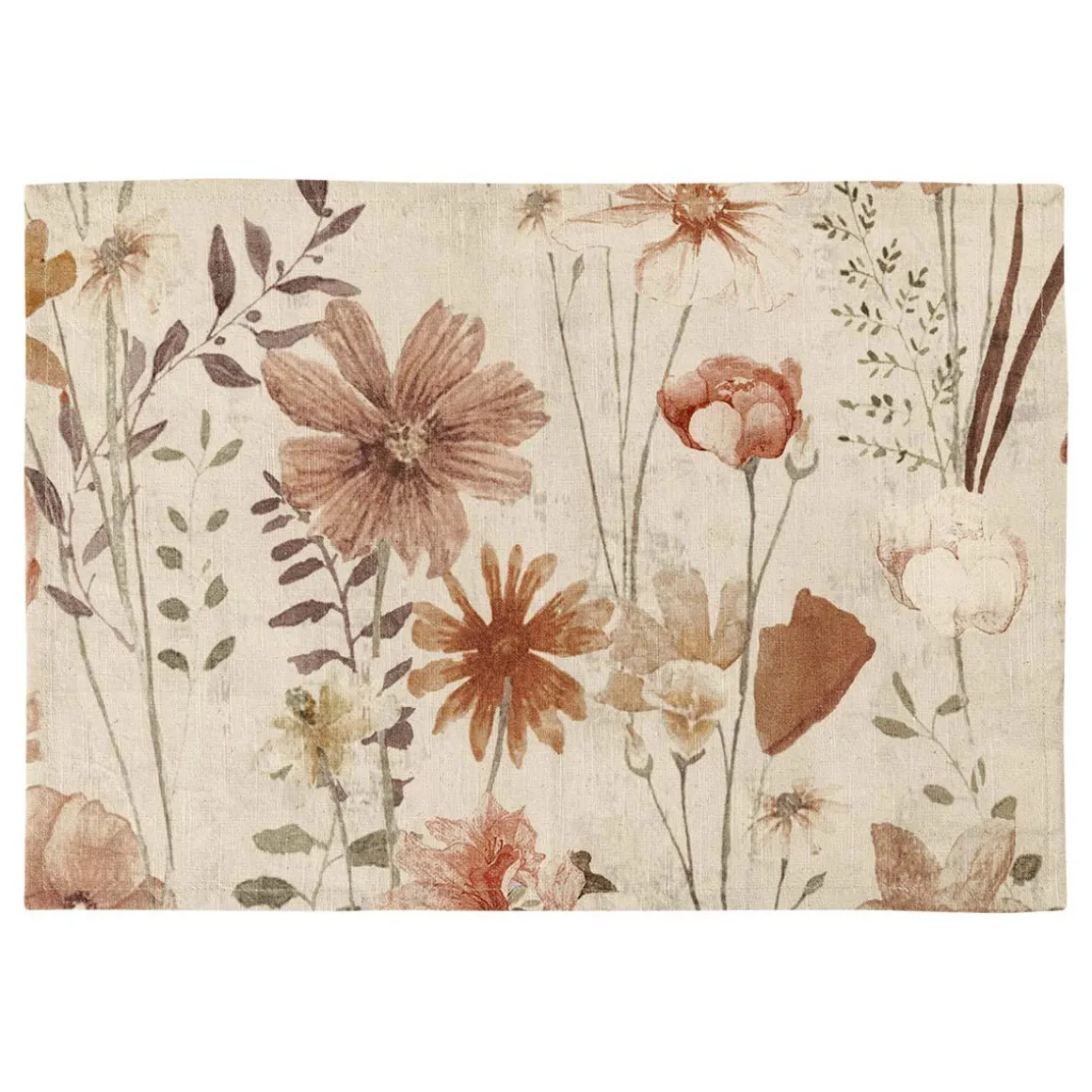 Blomster i varme toner gir borddekkingen et vennlig og lett uttrykk. Passer godt til både hverdag og kaffestunder. Brikken gjør seg godt sammen med servise i krem eller dus grønn.