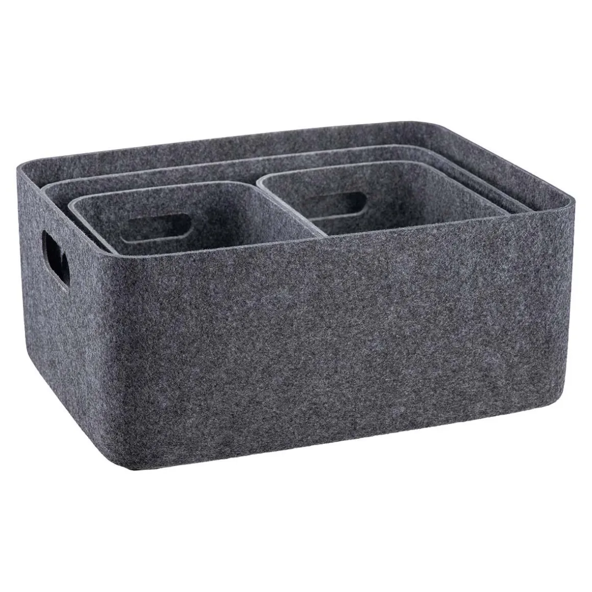 Fire praktiske kurver i myk filt som gjør det lett å få orden – enten det er på kontoret, i gangen eller inne i skapet. Settet består av to små, én mellomstor og én stor kurv, alle med håndtak som gjør dem enkle å flytte på.