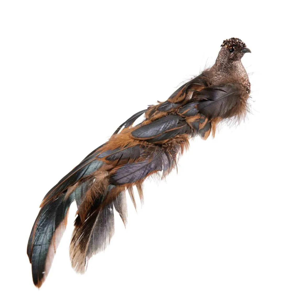 En vakker fugl på klype i brun farge med glitrende detaljer og fjær. Denne dekorative fuglen kan enkelt festes på grener, kranser eller andre steder for å skape den ultimate julestemningen!