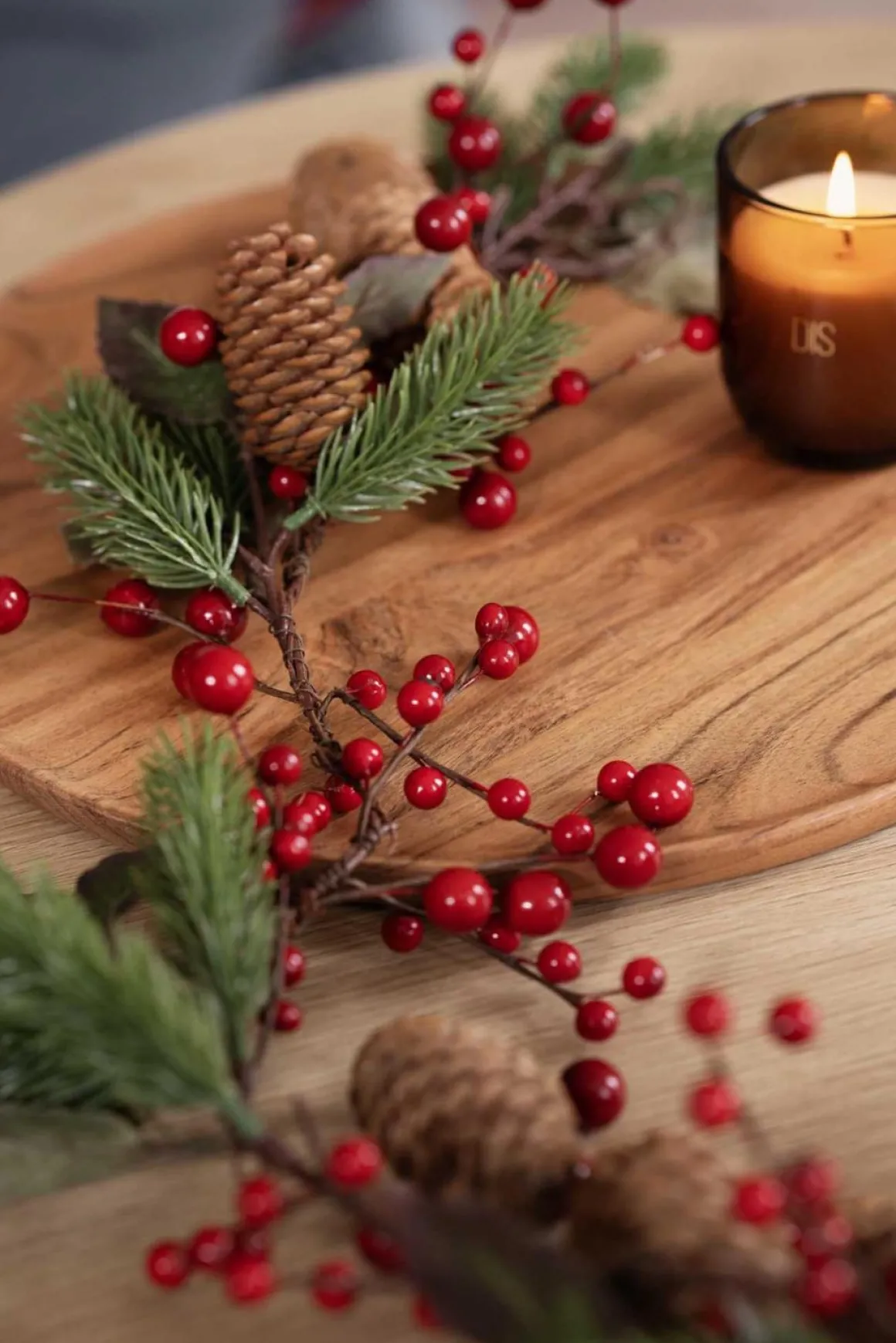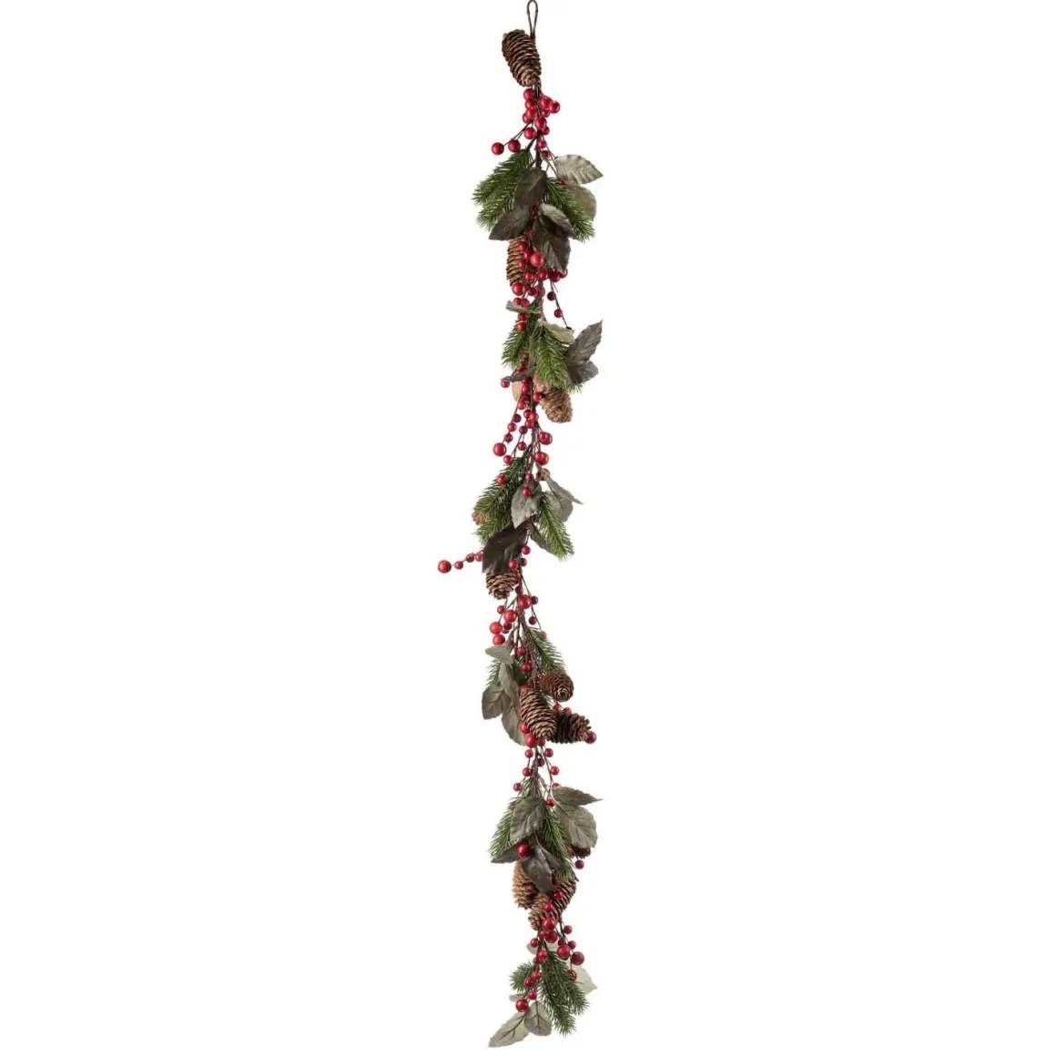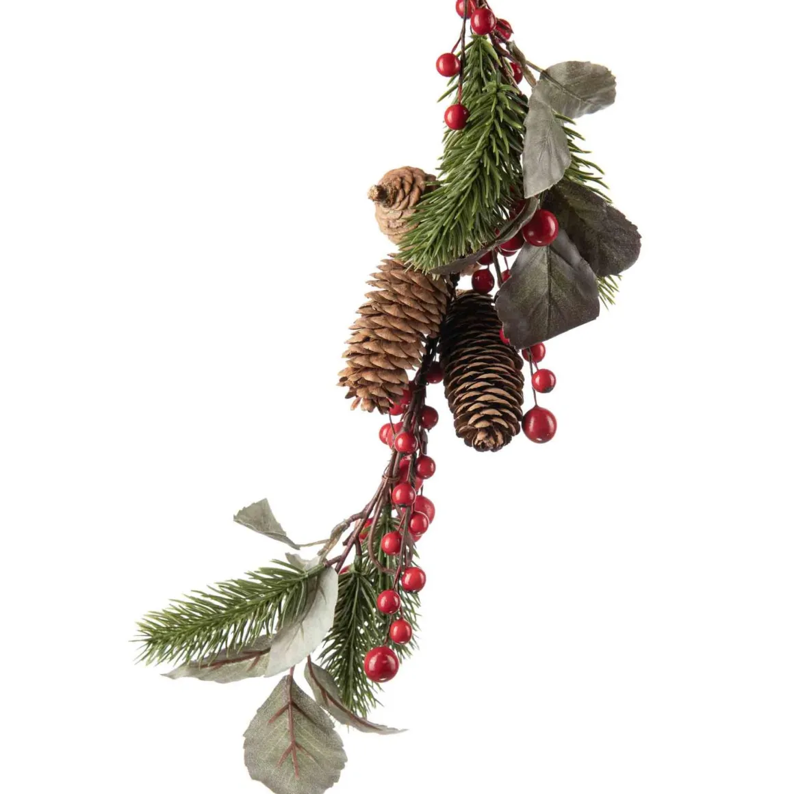 Girlanderen med kongler og røde bær er en vakker dekorasjon som bringer naturens skjønnhet inn i hjemmet ditt. Med sine realistiske kongler og livlige røde bær, tilfører den en festlig og naturlig atmosfære til enhver plass.