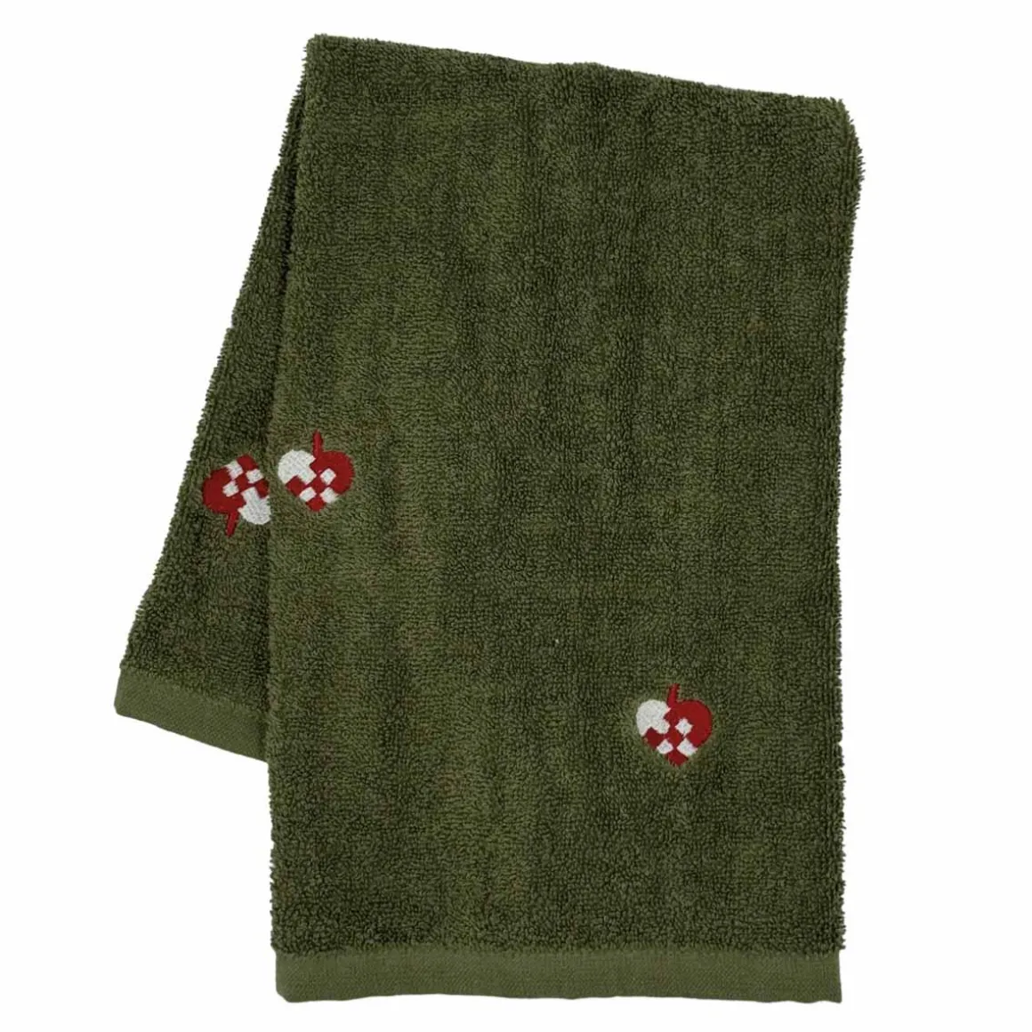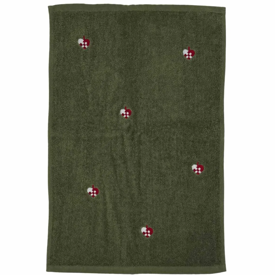Mykt og dekorativt gjestehåndkle i dyp grønnfarge med broderte julehjerter. En liten detalj som gir badet ditt et varmt og koselig preg i høytiden.