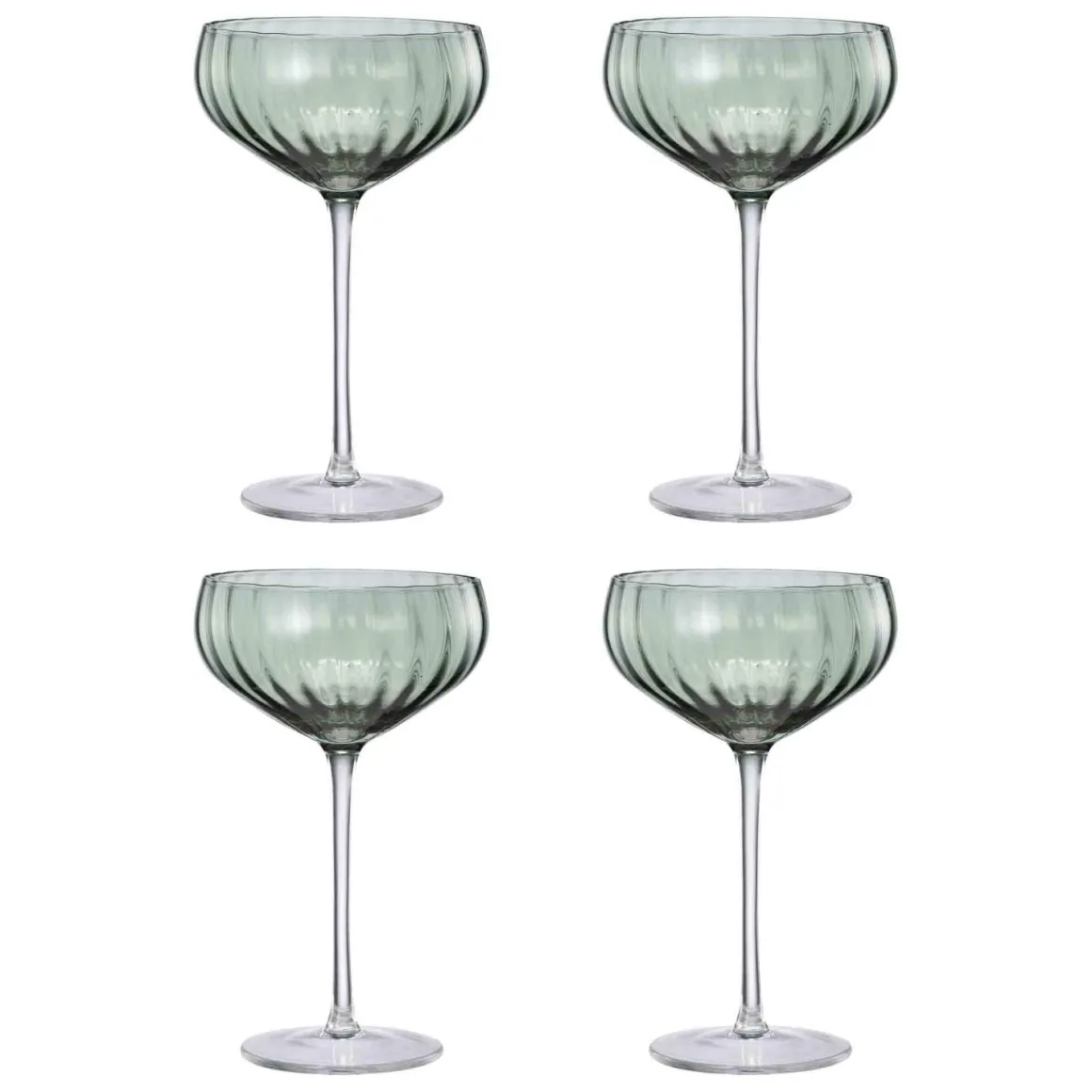 Sett med fire elegante champagneglass i en dus grønn tone med vakkert riflet design. Perfekte til festlige anledninger eller når du vil dekke bordet med stil.