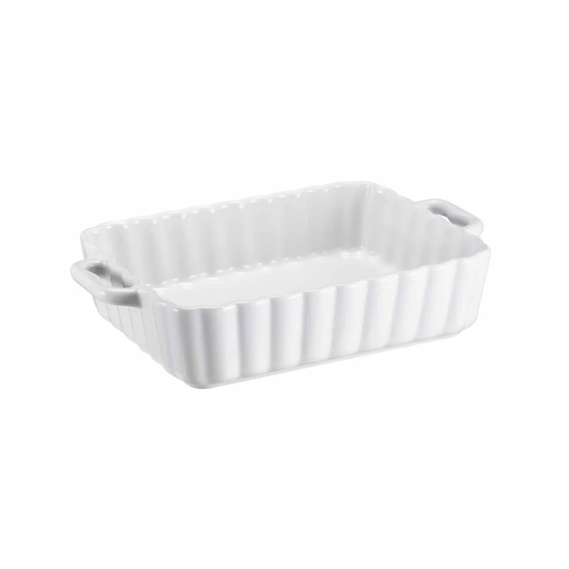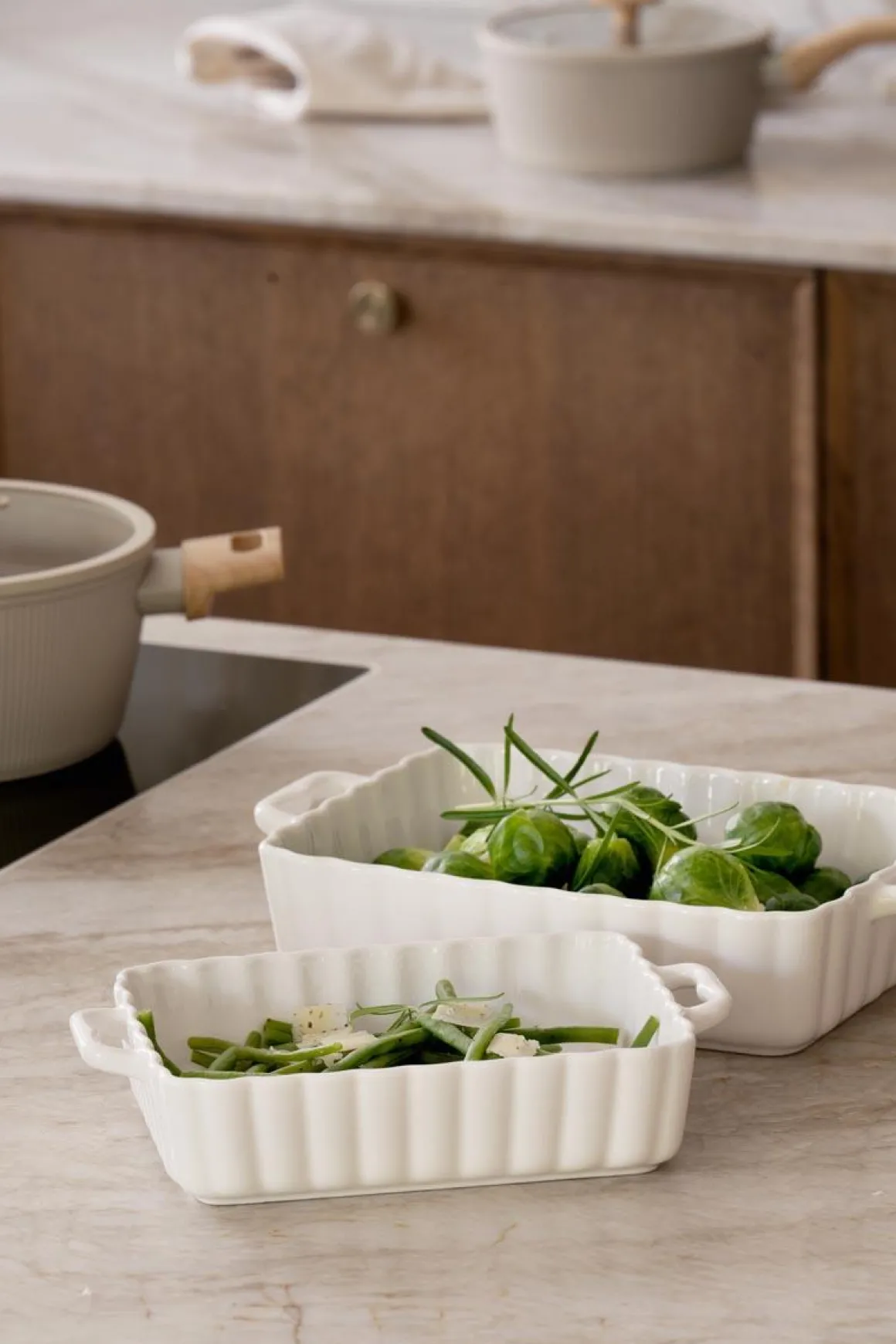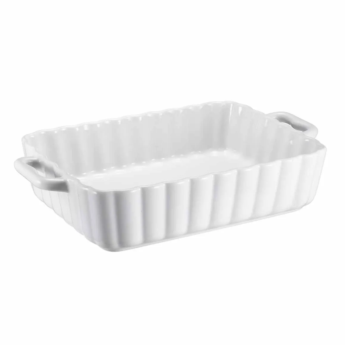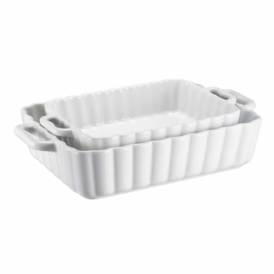 Sett med to hvite ildfaste former i tidløst design, perfekte til både hverdagsmåltider og festlige anledninger.