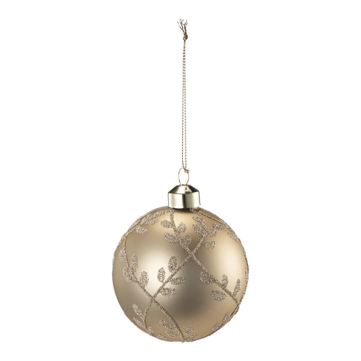 En matt gullfarget julekule dekorert med glitrende bladmotiv som gir et rolig og elegant uttrykk. Perfekt til deg som ønsker en harmonisk stil på juletreet. Kombiner den gjerne med våre andre i rødt og champagne for en fin helhet.