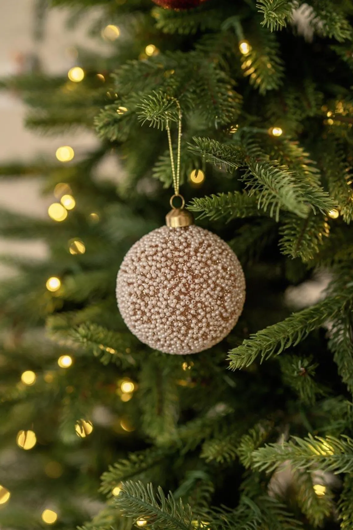 Juletrekule dekket med små perler og glitrende detaljer som gir et luksuriøst og pyntet uttrykk på treet. Passer perfekt til en elegant og lys juledekor. Kombiner den gjerne med i gull, hvitt og champagne for en gjennomført stil.