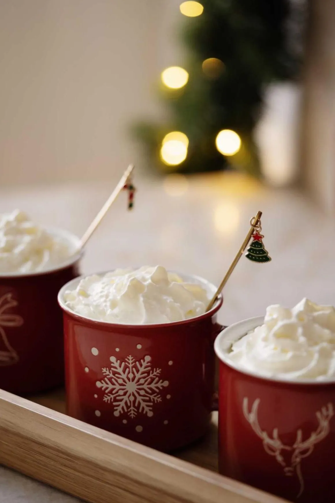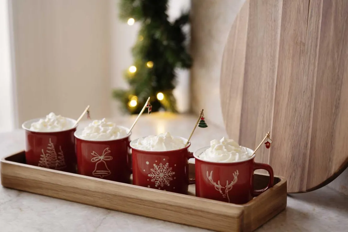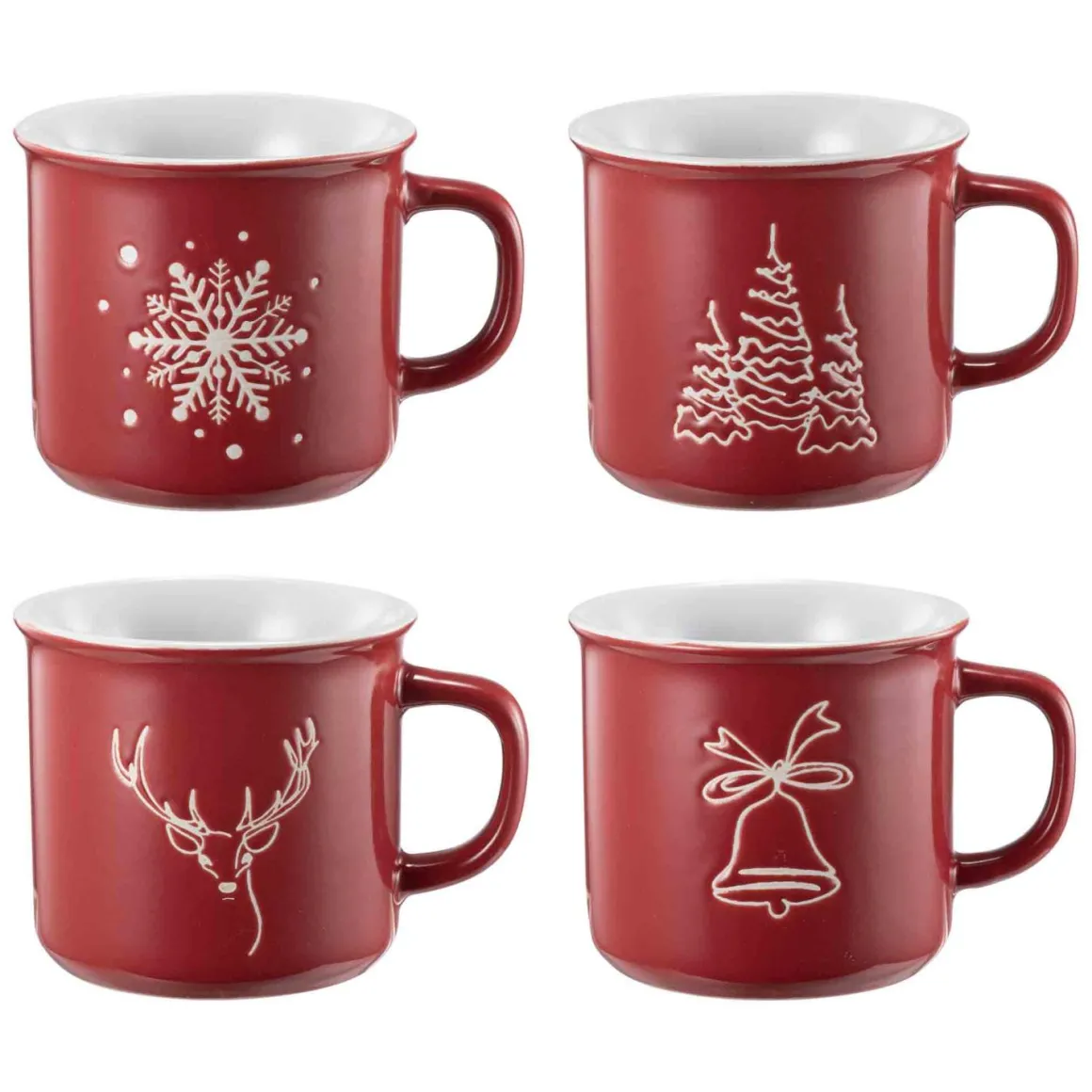 Fire røde kopper med koselige julemotiver, perfekte for varm sjokolade, kaffe eller te. Disse koppene er et hyggelig tillegg til julebordet som skaper en varm og innbydende stemning.