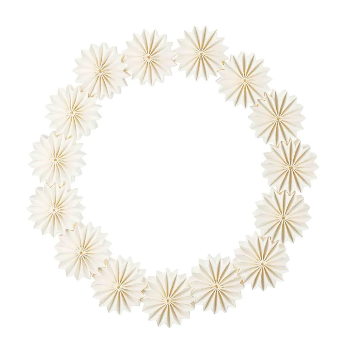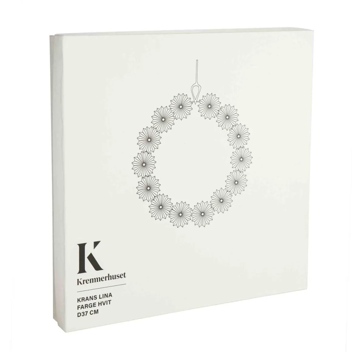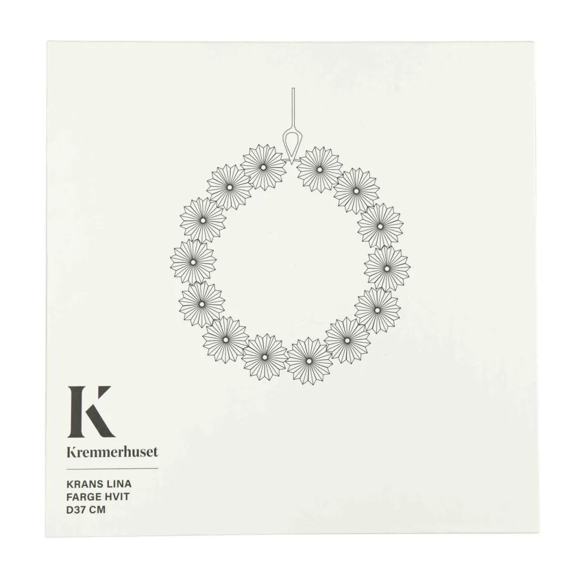 Krans Lina er en krans som passer fint i vinduet eller som aksent på døra. Den kommer i en eske slik at den er enkel å oppbevare eller perfekt å gi bort som en gave. Kransen er laget av papir, og har en søt blomsterform.