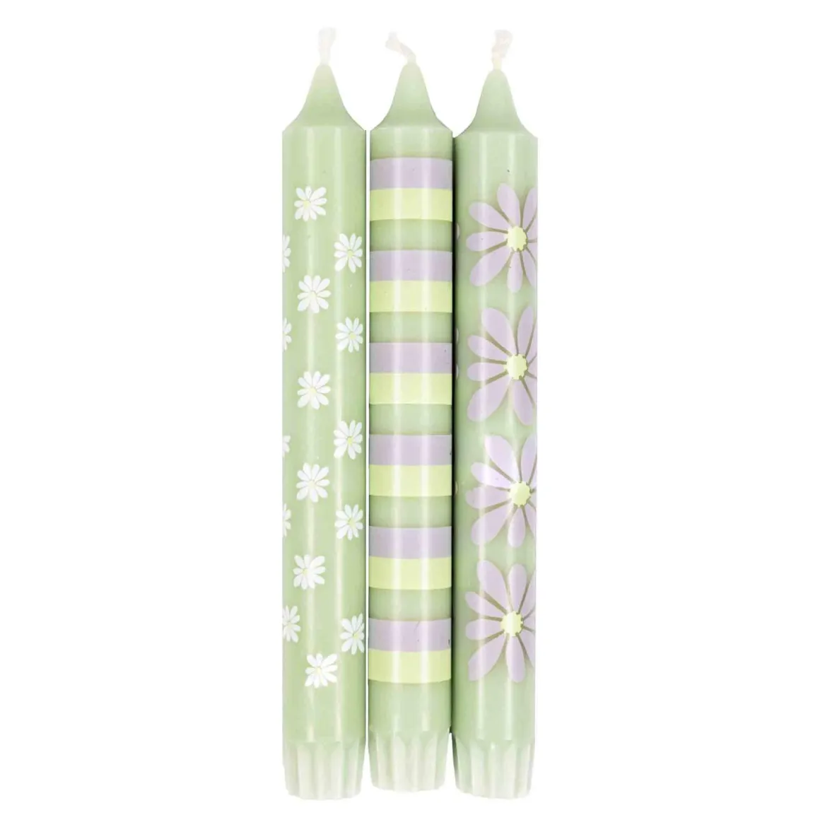 Tre kronelys av 100% stearin med forskjellig design, men som passer godt sammen. Bruk de gjerne som lys til borddekkingen eller som gave sammen med en .