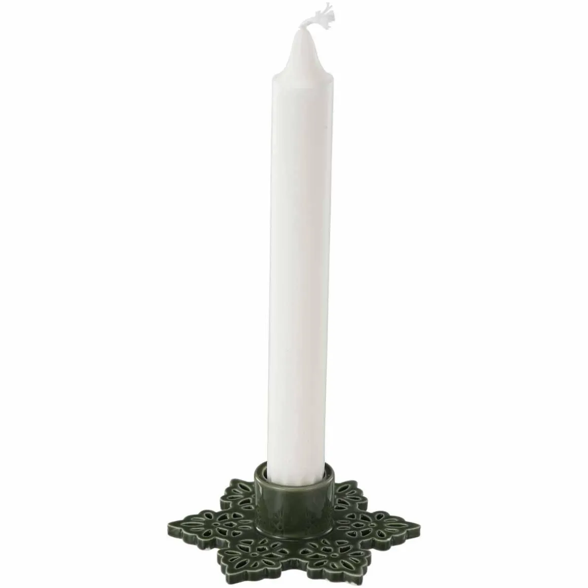 En liten, sjarmerende lysestake med snøflakdetaljer i grønn. Perfekt for høytidens lys og dekorasjoner! Finnes også i !