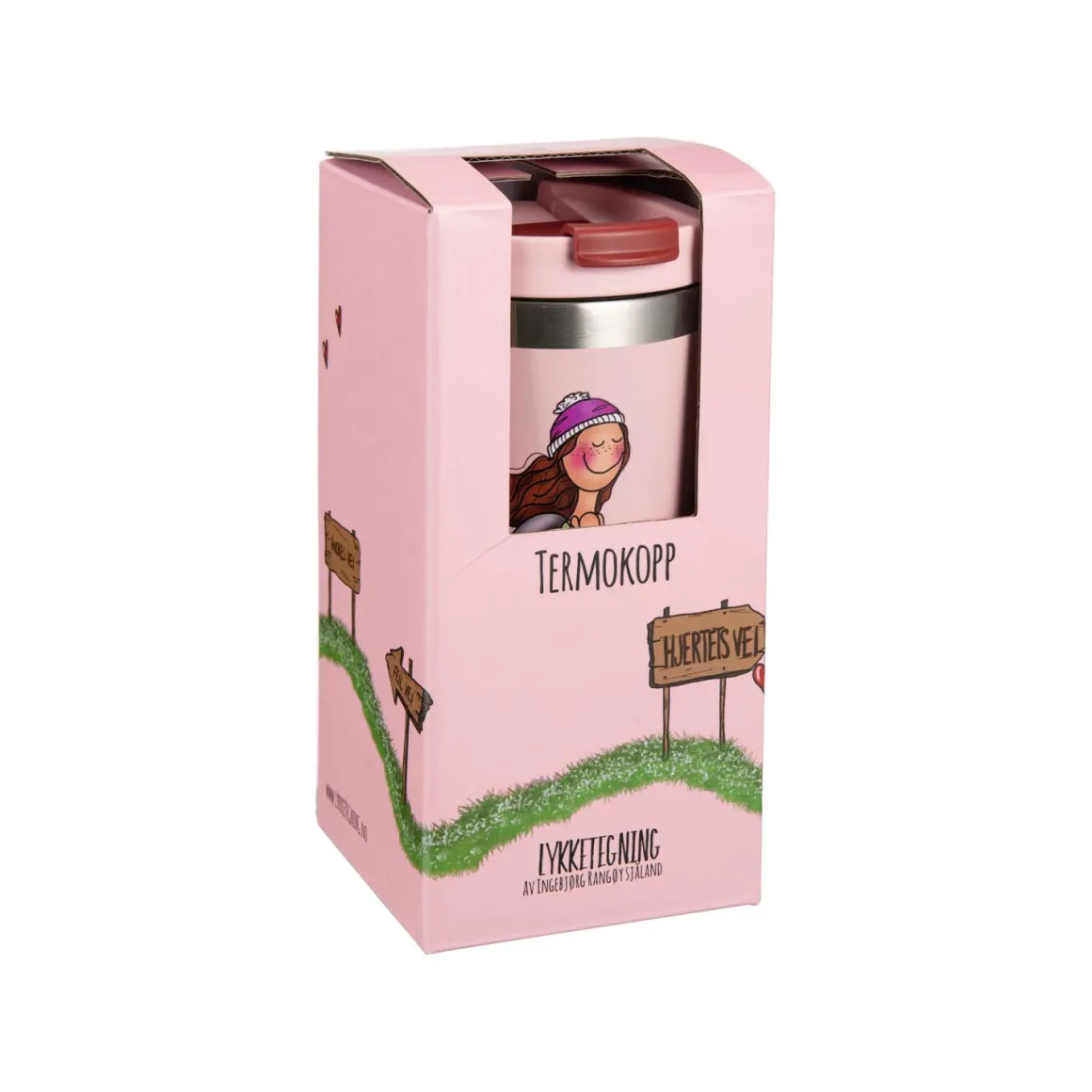 Hjertets vei termokopp fra Lykketegning i rosa er både funksjonell og inspirerende. Denne termokoppen er utsmykket med et motiv av en jente som følger en pil med teksten «hjertes vei», noe som gir en oppmuntrende og personlig touch. Perfekt for å holde drikken varm mens du er på farten, og samtidig minne deg på å følge hjertet ditt.