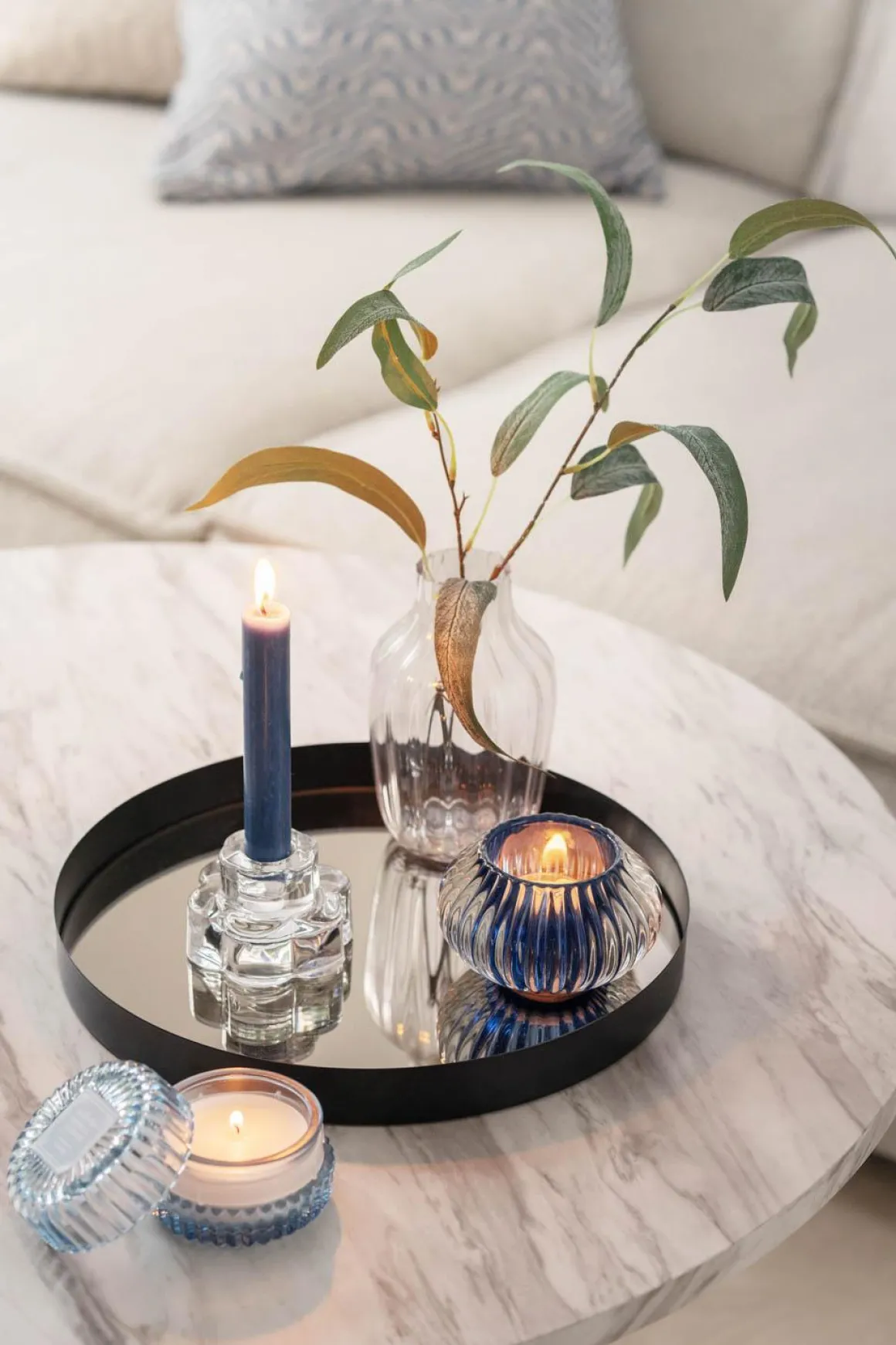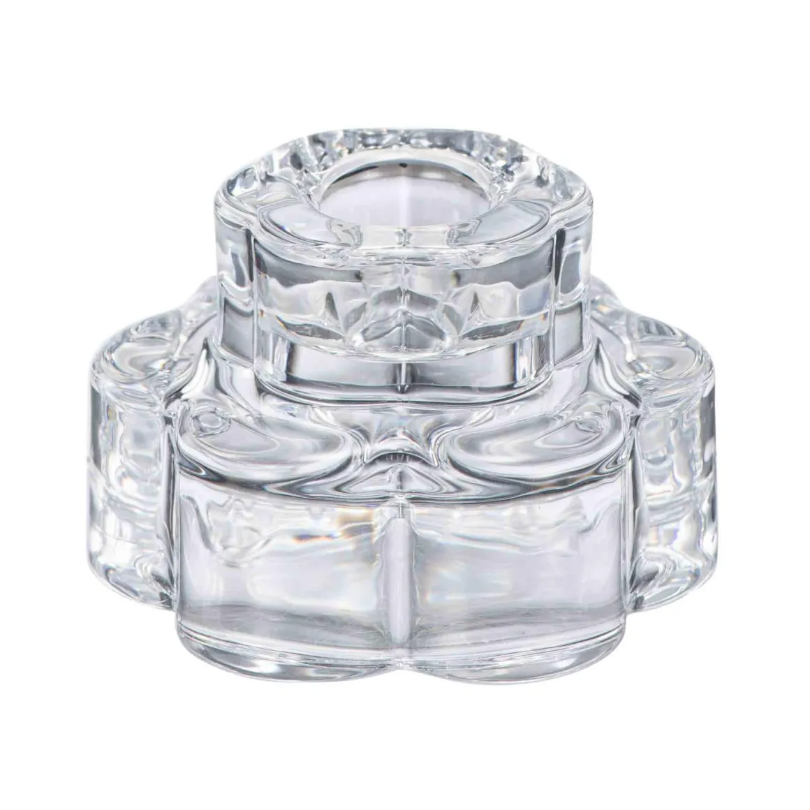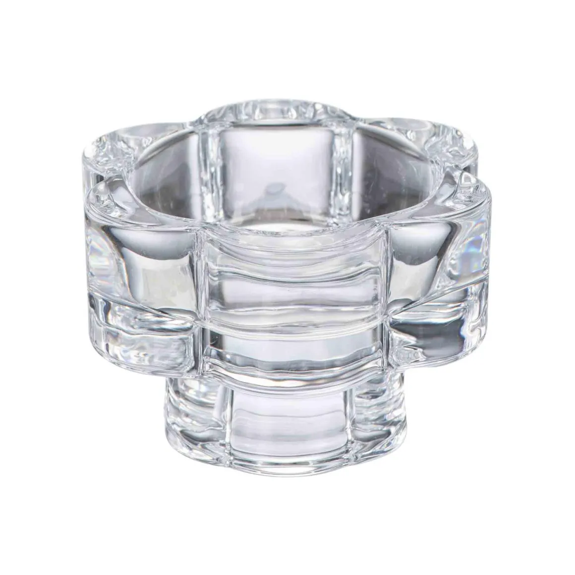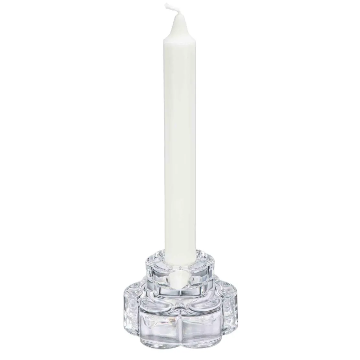 i lyset en elegant plass å skinne med denne vakre lysestaken i klart glass. Den geometriske blomsterformen gir et harmonisk uttrykk og reflekterer lyset på en måte som skaper en varm og behagelig atmosfære. Perfekt til både stearinlys og telys, denne lysestaken er ideell til å skape små, koselige øyeblikk i stuen, på spisebordet eller som en del av et dekorativt oppsett.