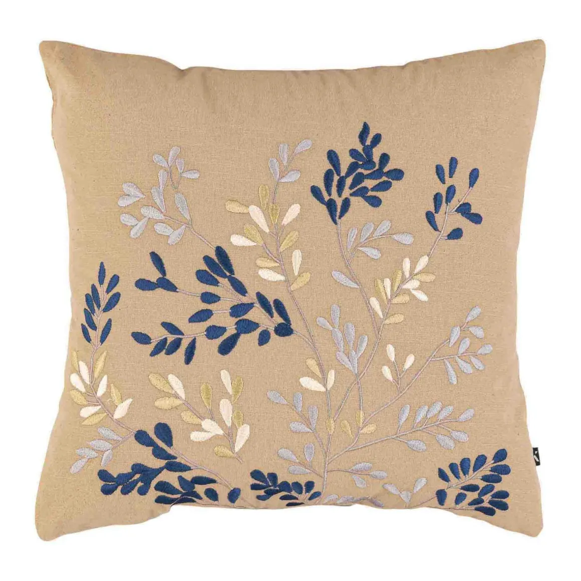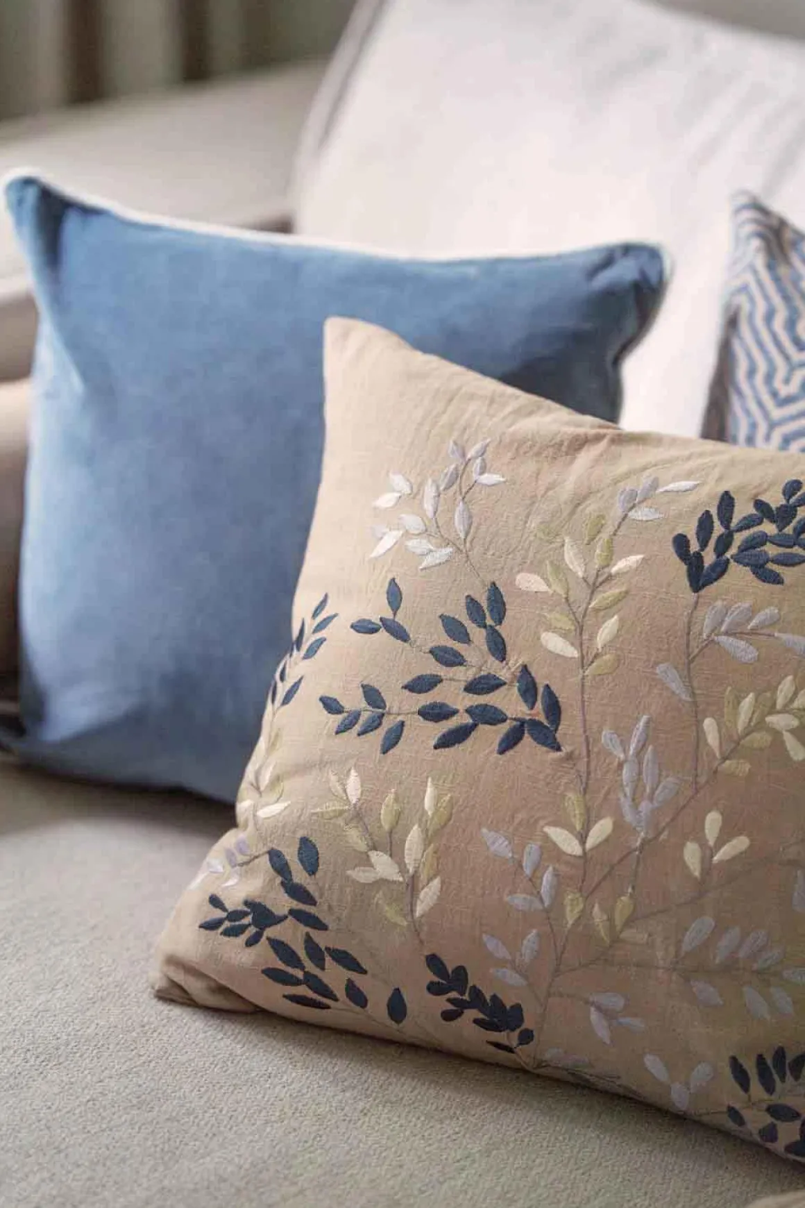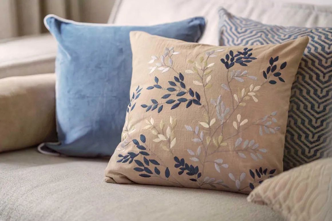 Putetrekket bringer naturens detaljer inn i stuen med et brodert mønster i blå og nøytrale toner. Den lune fargen skaper en rolig base, mens de delikate grenene gir en følelse av liv. Perfekt alene i en stol eller som del av en sofagruppe. Kombiner med myke velurputer i blått eller beige for et harmonisk uttrykk, eller legg til en strukturert for ekstra dybde.