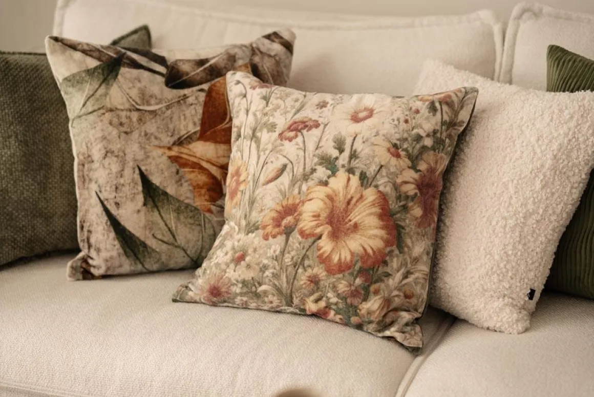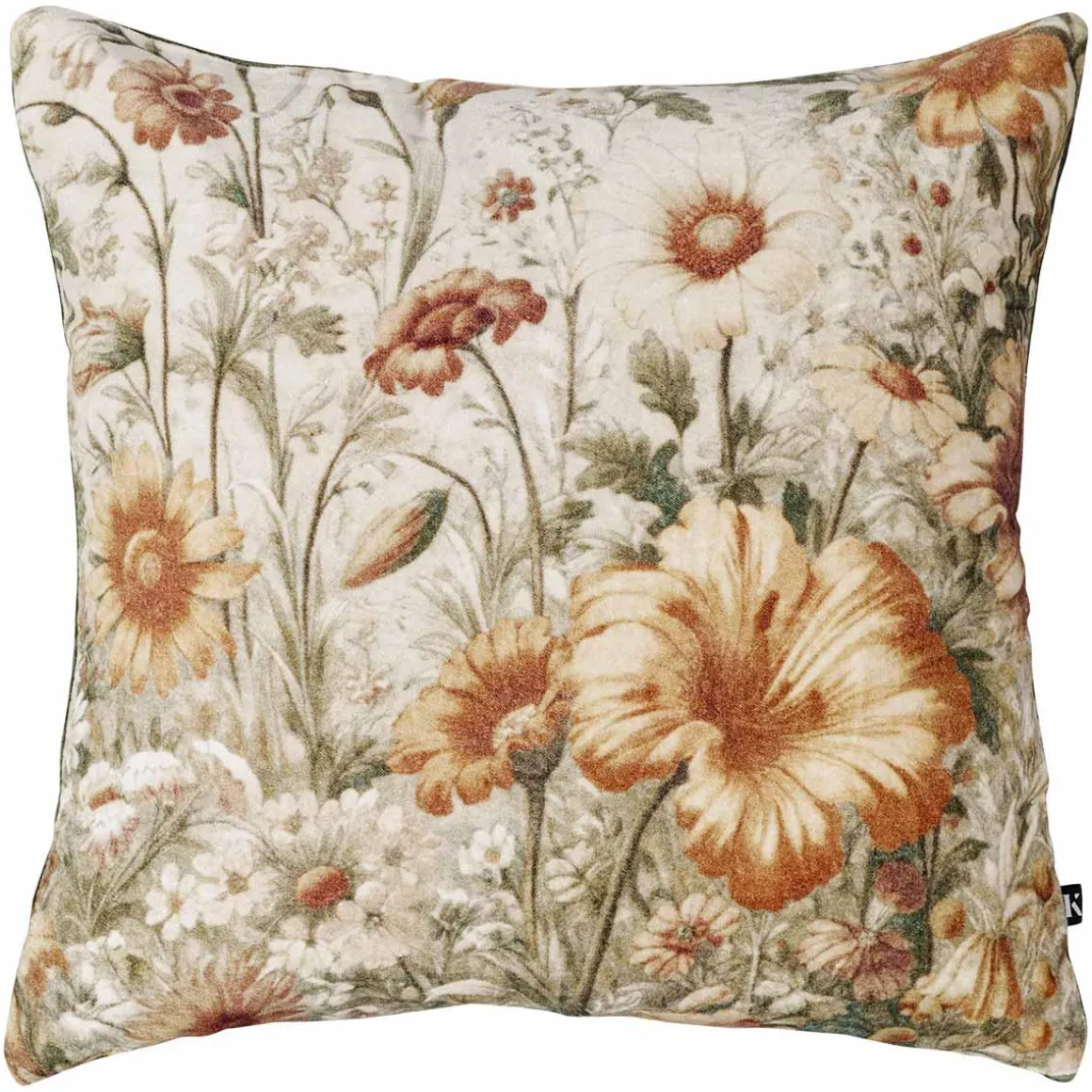Et blomsterhav i dype gule, grønne og rusttoner gir en lun følelse gjennom hele sesongen. Putetrekket har et nostalgisk uttrykk. Kombiner gjerne med grove tekstiler, nøytrale eller velurputer i varm grønn eller brent oransje for et mykt og samstemt uttrykk i sofaen.