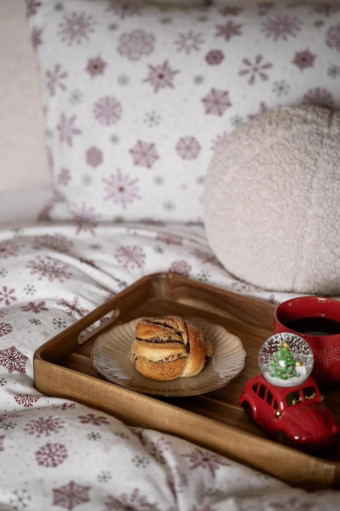 Dette sengetøyet har et mønster av snøfnugg i ulike former og farger som gir en vinterlig stemning på soverommet. Settet inneholder både dynetrekk og putetrekk, laget i et behagelig materiale som sikrer en komfortabel og god søvn. Ideelt for å skape en hyggelig atmosfære i den kalde årstiden.