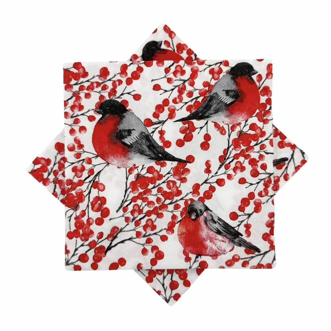 Disse papirserviettene har et motiv av dompaper og røde bær, som gir en koselig stemning til bordet.