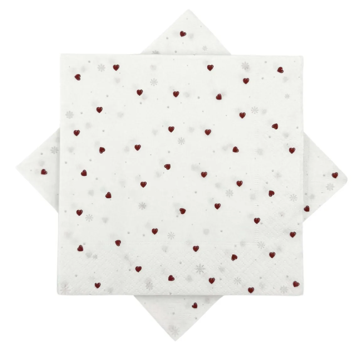 Disse serviettene med små, røde hjerter og snøfnuggmønster setter et koselig preg på borddekkingen.