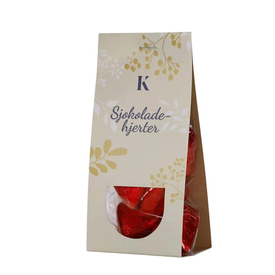 Sjokoladehjerter pakket i rødt folie – en søt gaveidé eller en liten oppmerksomhet til deg selv. Perfekte til høytider, feiringer eller en koselig kaffepause.