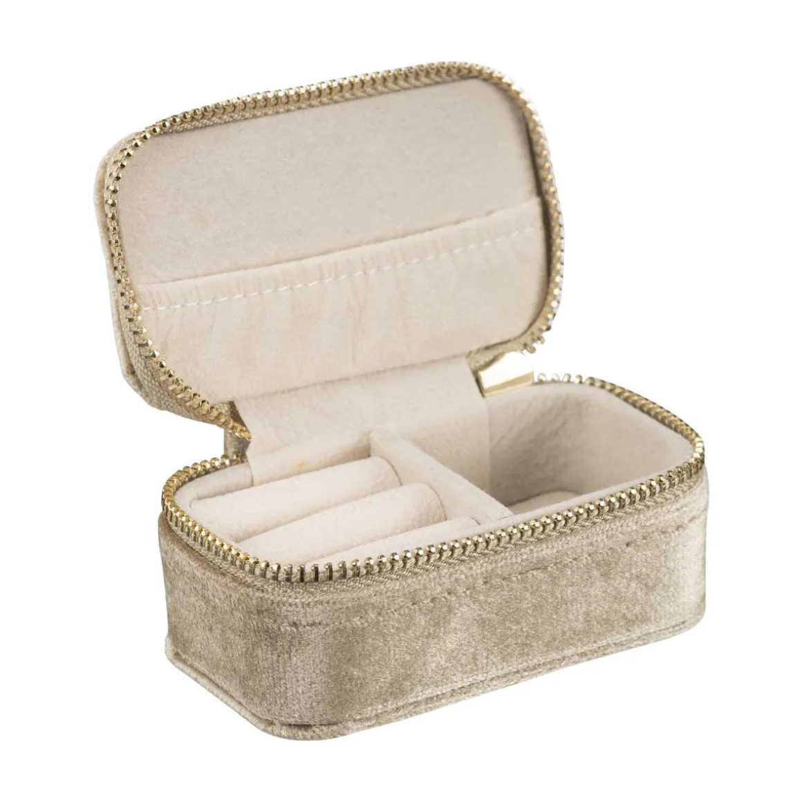 Lite smykkeskrin med glidelås – perfekt for smykker på farten eller som fast plass på nattbordet. Utsiden er trukket i myk velur og innsiden rommer både ringer og øredobber.