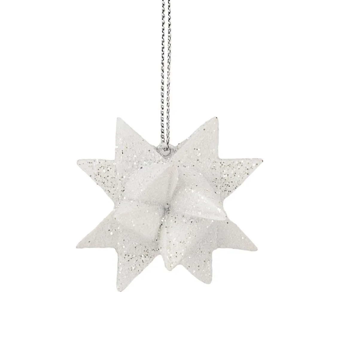 Søte små snøstjerner med oppheng dekorert med glitter. Perfekt til å henge på juletreet som en siste prikken over i’en. Kan også brukes som dekorasjon på dekket bord, eller på et pyntet lysfat.