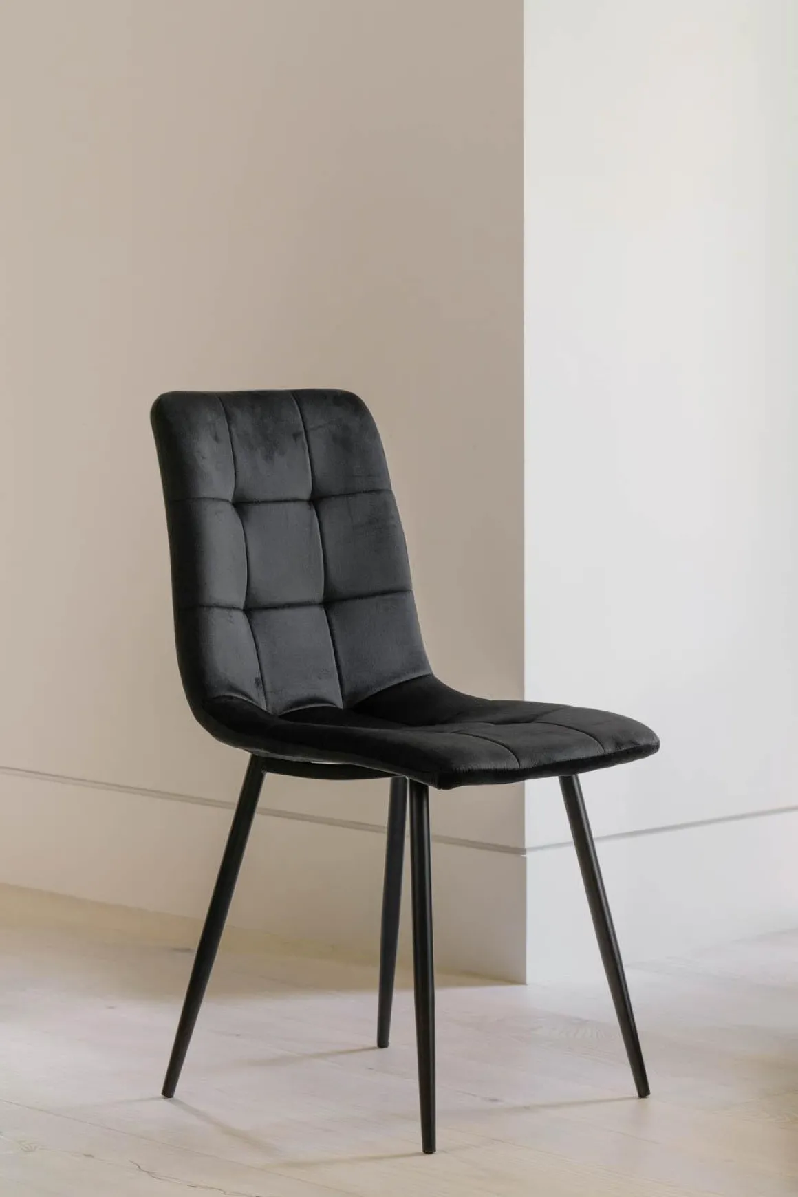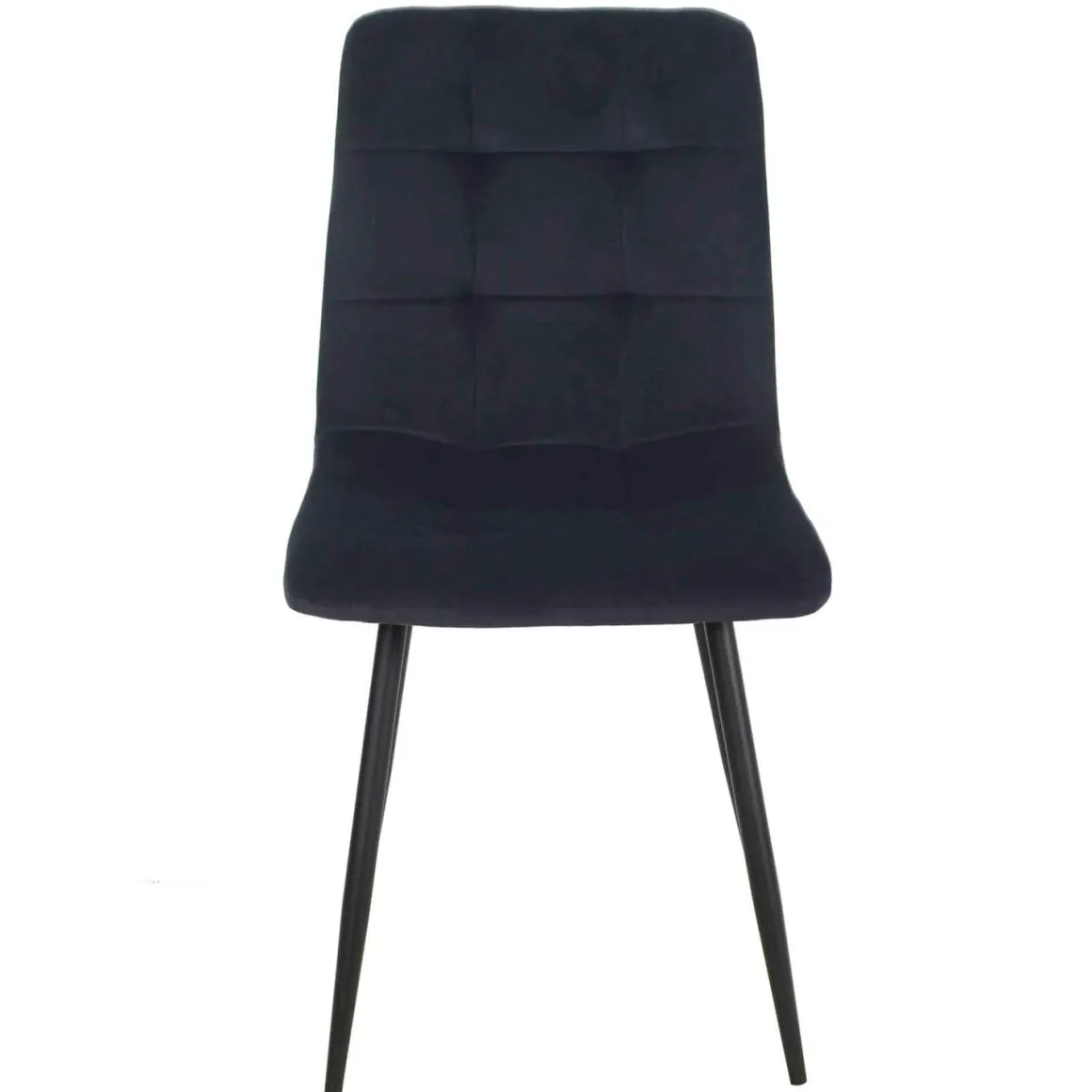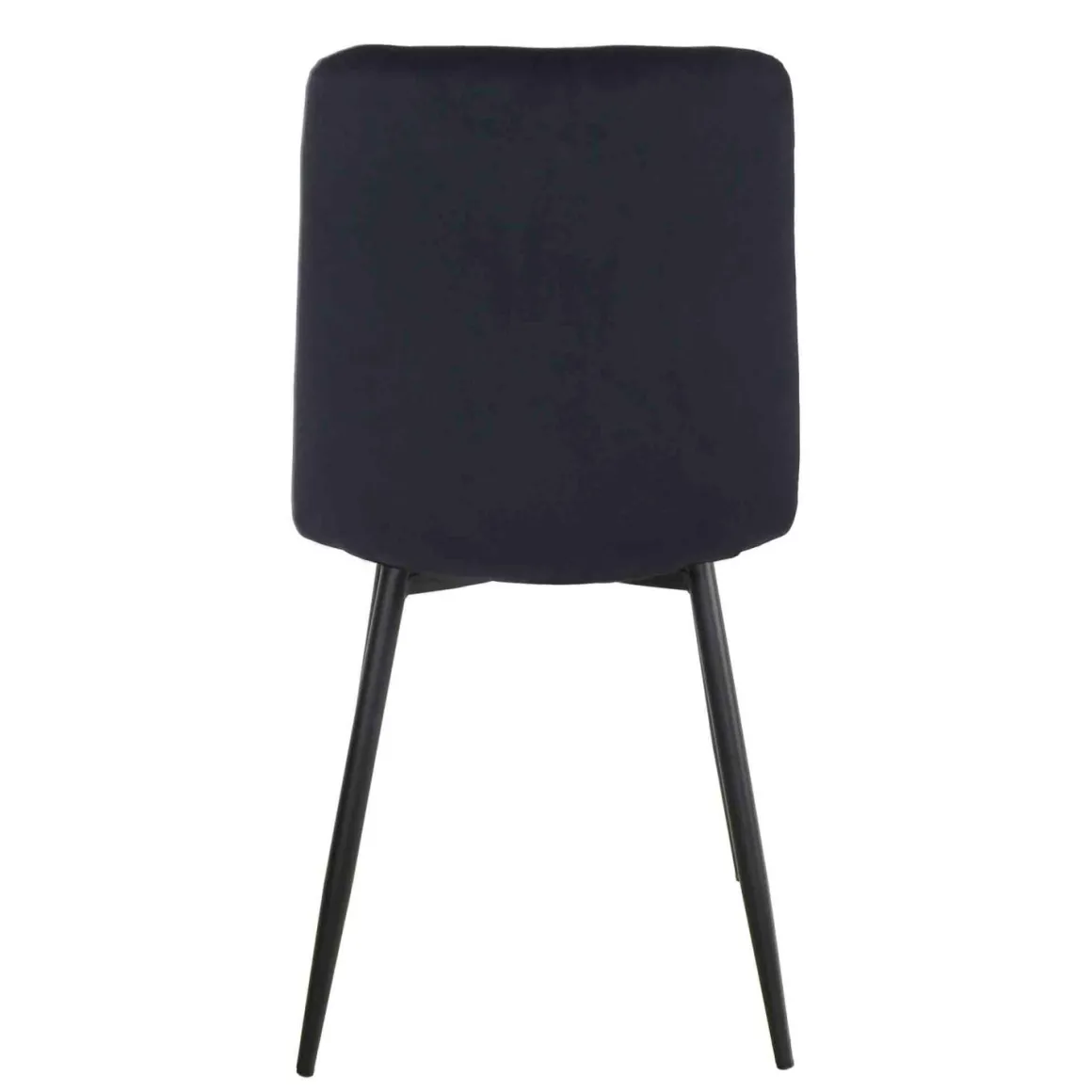 Spisestolen i dyp sort kombinerer et komfortabelt polstret sete med et moderne rutemønster. De sorte metallbena gir en minimalistisk kontrast som passer perfekt til både mørke og lyse spisebord. Ideell for alt fra hyggelige familiemiddager til rolige kaffestunder.