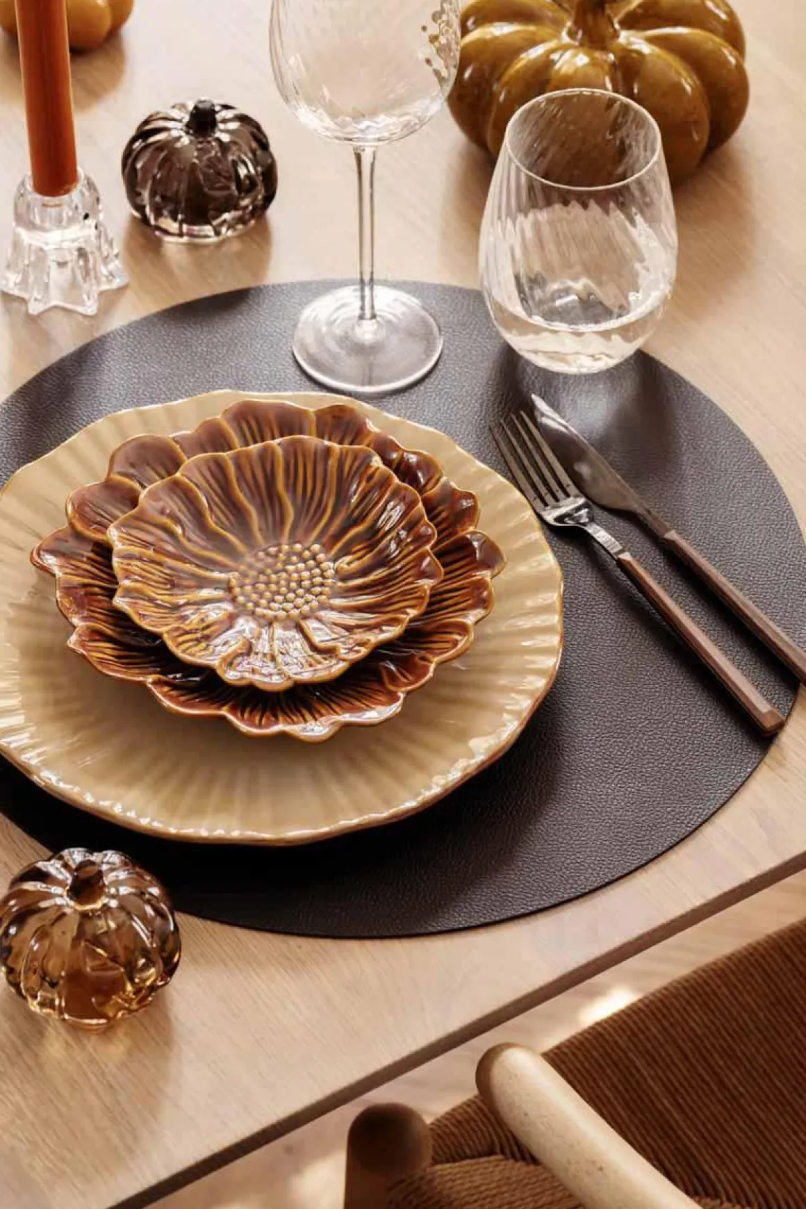Vår tallerken i cognacfarge, formet som en blomst, tilfører en unik og naturlig sjarm til ditt servise. Denne vakre tallerkenen kombinerer funksjonalitet med et elegant design, noe som gjør den perfekt for både hverdagsbruk og spesielle anledninger. Tilgjengelig i , passer den til enhver type servering.