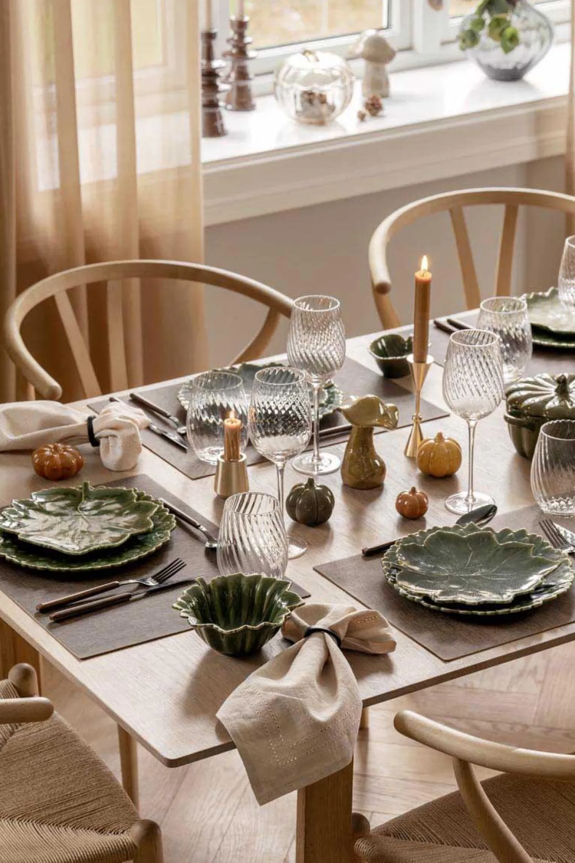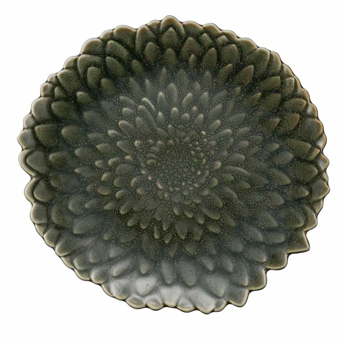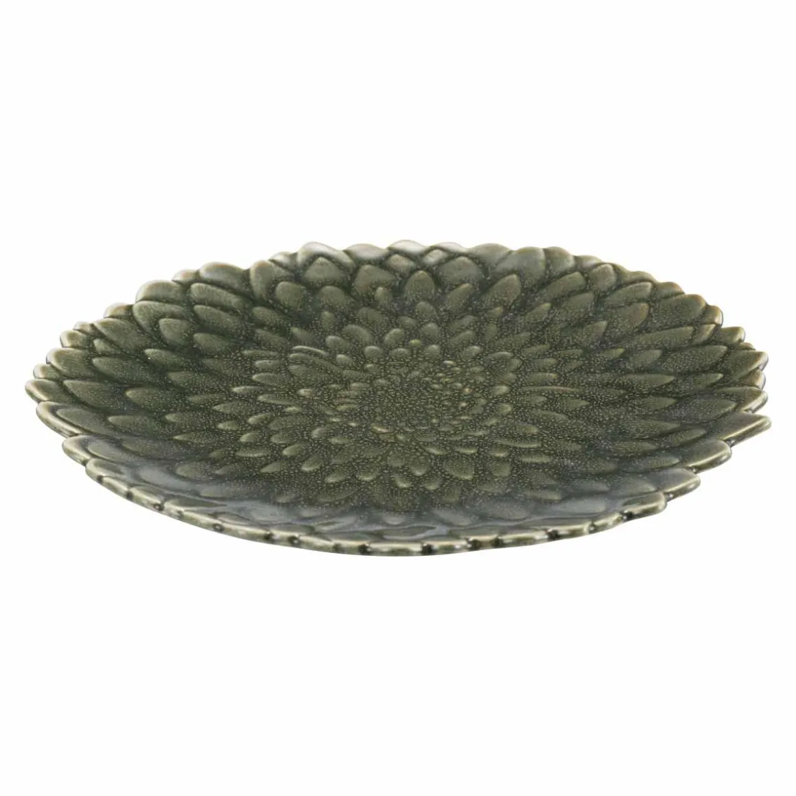 Blomsterformen gir et vennlig uttrykk, og den dype grønntonen kler både småkaker, frukt og dekorasjoner. Et vakkert blikkfang til borddekkingen. Kombiner med matchende servise fra – eller miks med enkle glass og lyst servise for å skape kontrast.