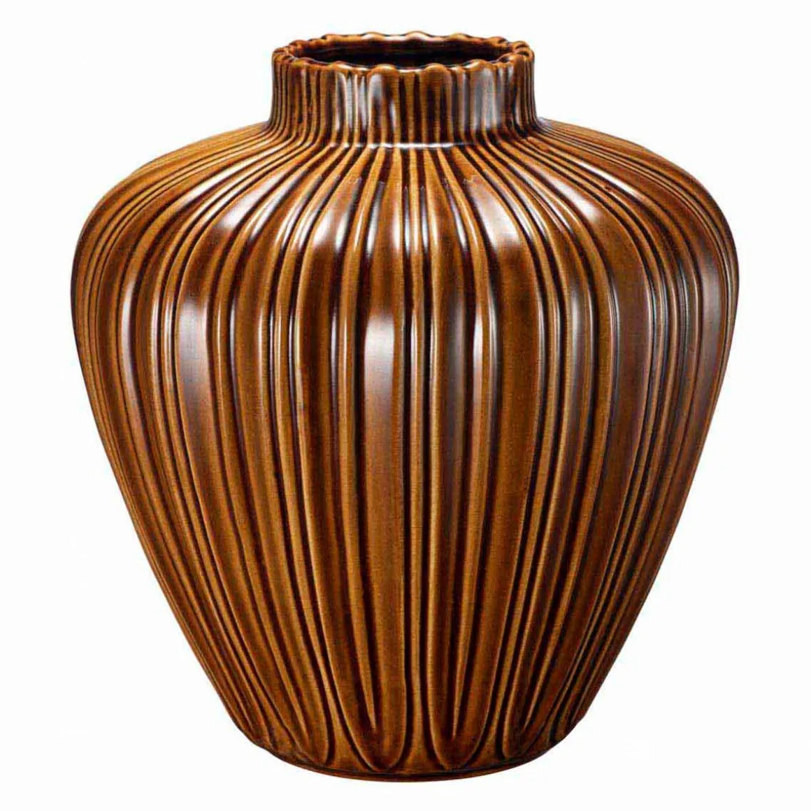 Stentøysvase med varme toner og vakre riller. Vasen har rolig og balansert inntrykk. Perfekt alene på en kommode eller sammen med